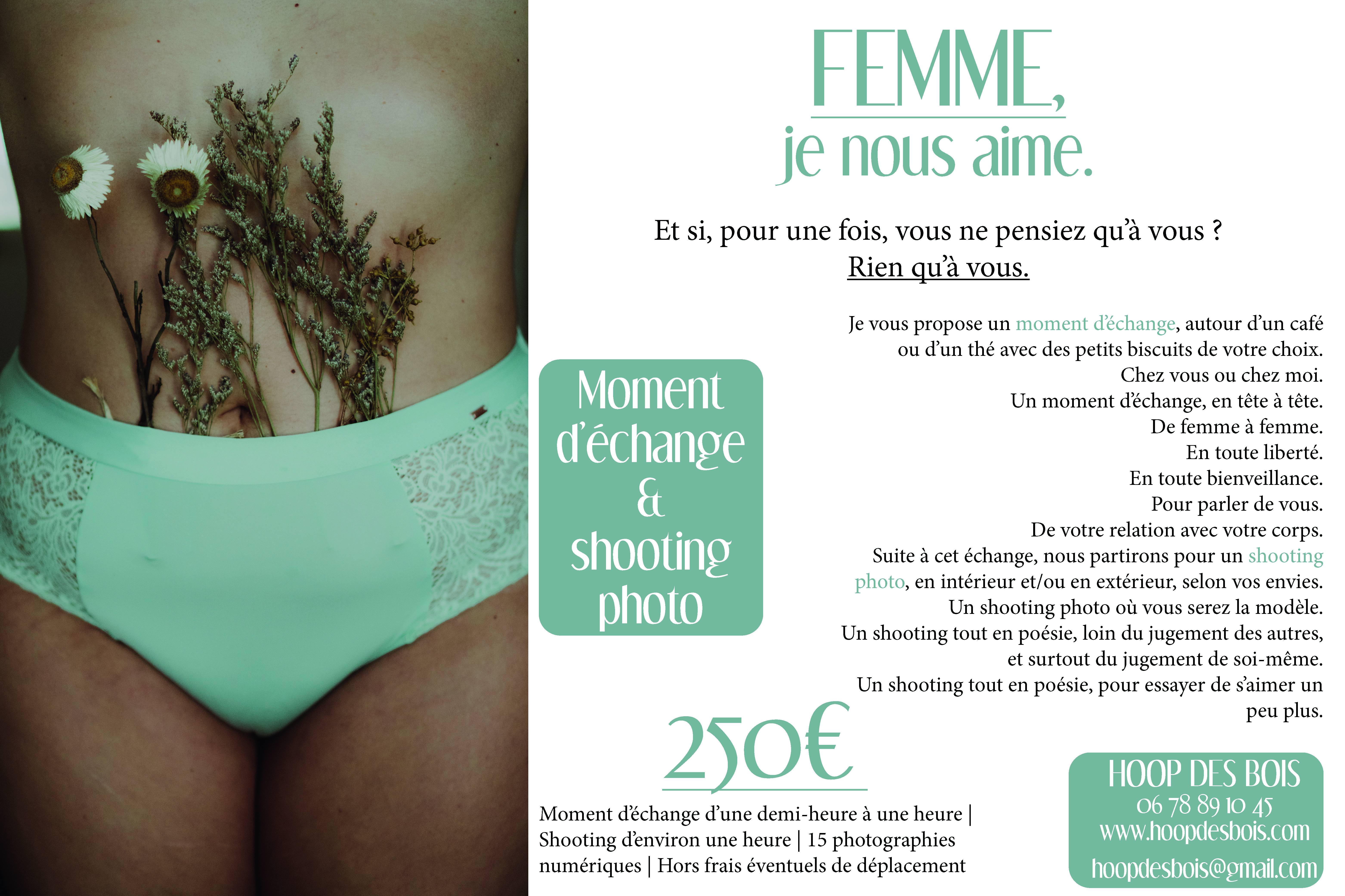 – Séance photo qui te ressemble. Un moment à toi, rien qu’à toi. Un moment que tu choisis pour des images qui te ressemblent. Tu peux te challenger en posant nue , être plus pudique en sous vêtements, ou alors vêtue de tes vêtements préférés. Aucune obligation, juste du plaisir et un moment chouette !